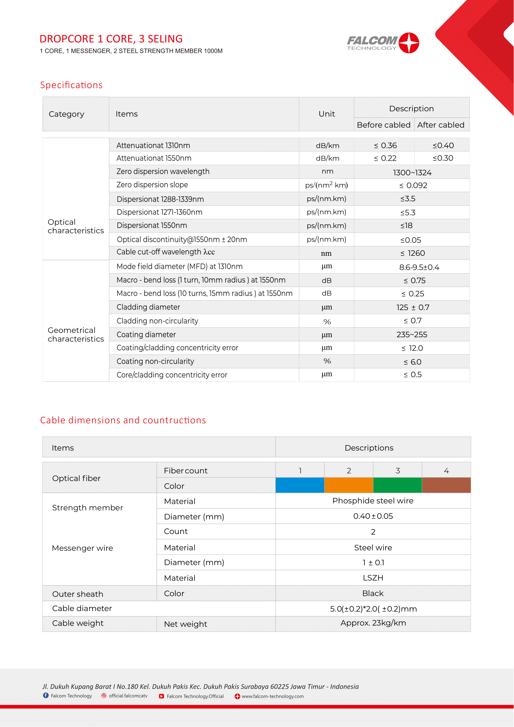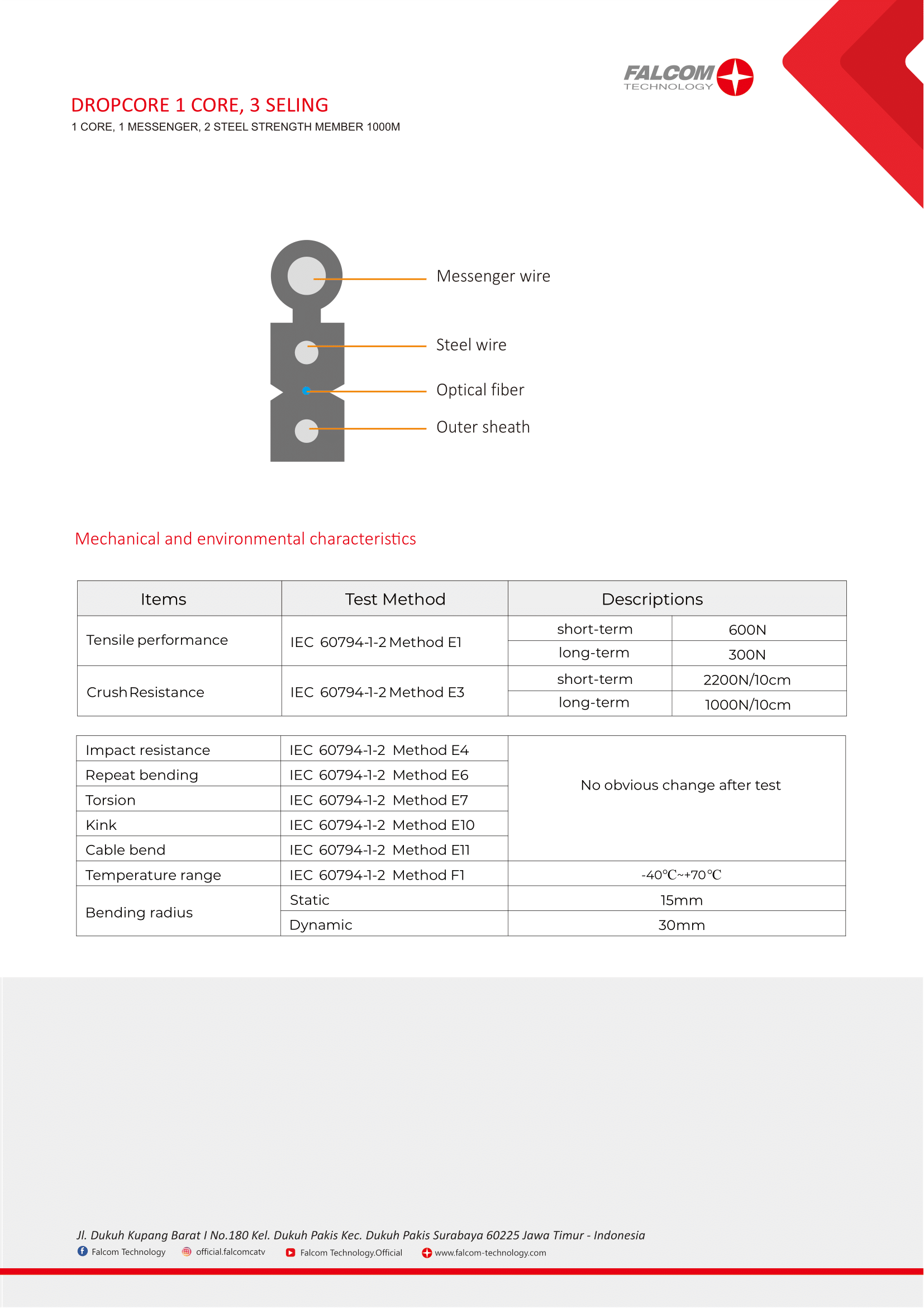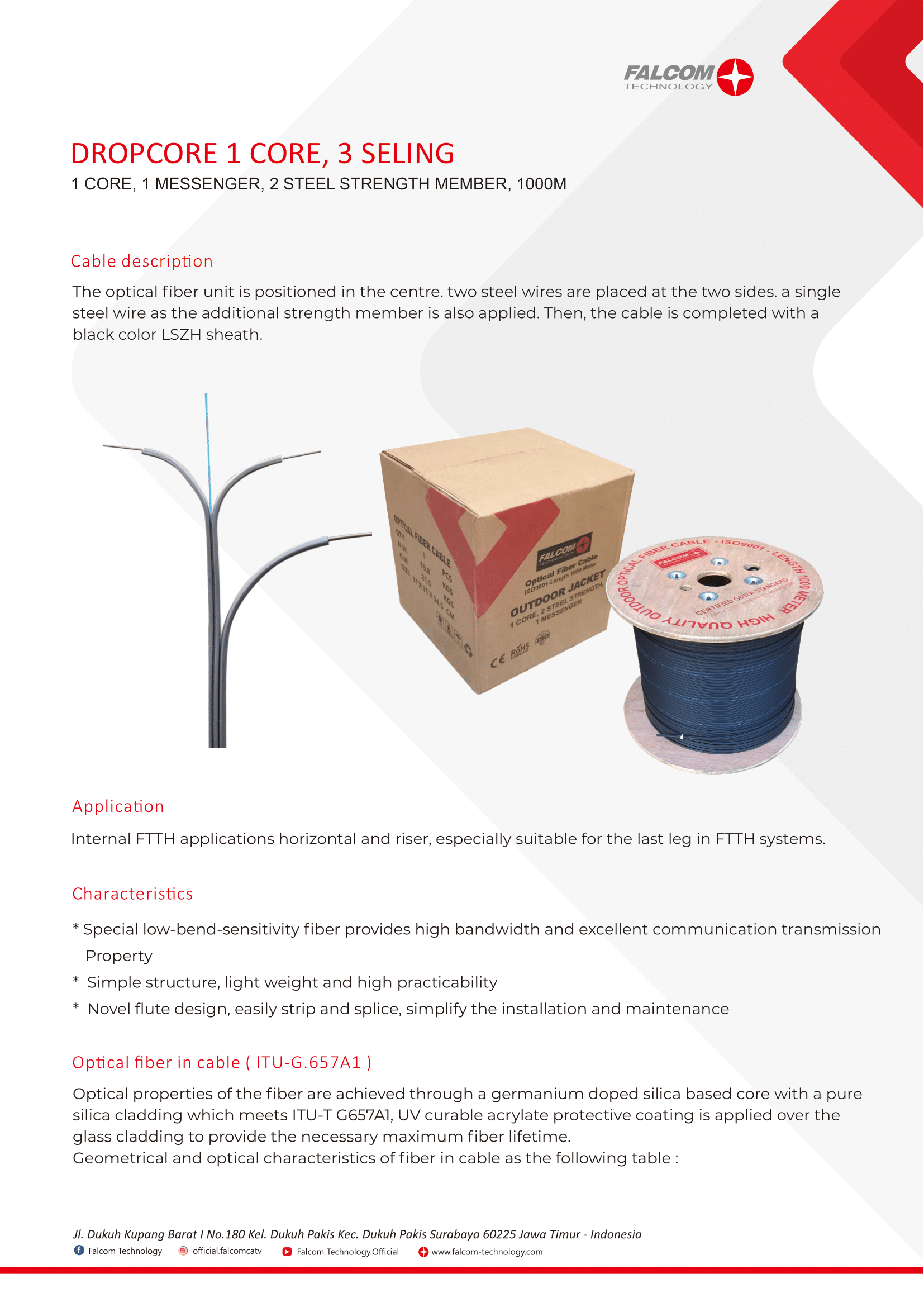GJYXCH-1F high quality dropcore adalah kabel fiber optik 1 core dengan bentuk pipih (flat ofc) dengan panjang 1.000 meter untuk instalasi jaringan broadband di dalam maupun di luar ruangan. Dengan jenis core singlemode G.657A yang terletak di bagian tengah antara dua strength wire membuat kabel dengan jaket berbahan LSZH ini memiliki performa tekukan dan fleksibilitas yang baik. Standar high quality self-supporting 1 mm messenger wire juga membuat kabel ini tahan dari tarikan dan tegangan berlebihan saat proses instalasi.